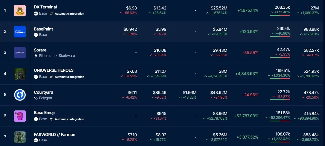 NFT-токены DX Terminal от Base заняли первое место по количеству продаж, совершив 1,27 млн транзакций, что более чем на 1000% больше, чем в предыдущем месяце.