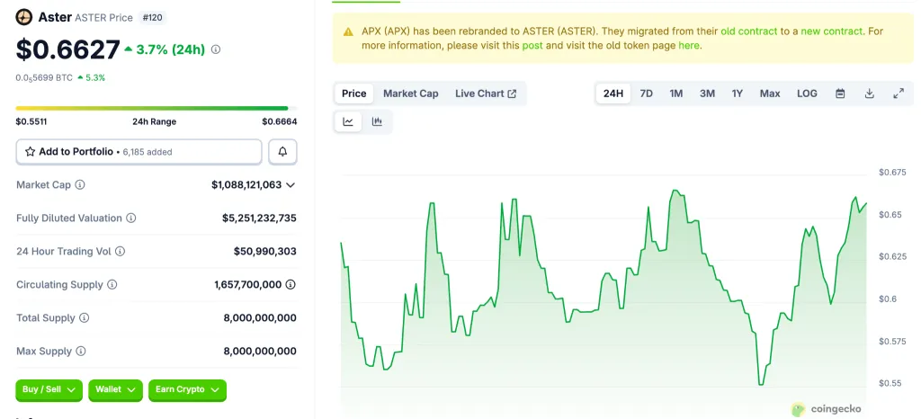 Капитализация токена ASTER тем временем достигла $1 млрд. На момент написания актив торгуется по $0,66, показав рост на 3,7% за сутки.