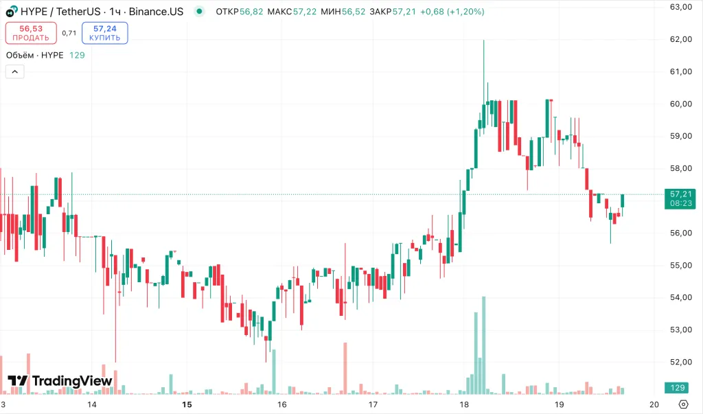 Цена HYPE составляет $57, а капитализация — $15,2 млрд. 18 сентября монета обновила исторический максимум на уровне около $60.