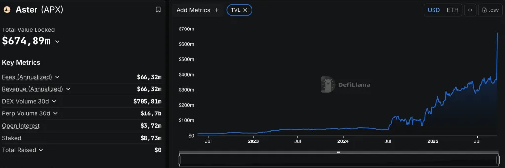 Aster обошла Hyperliquid по TVL: $674 млн против $671 млн.