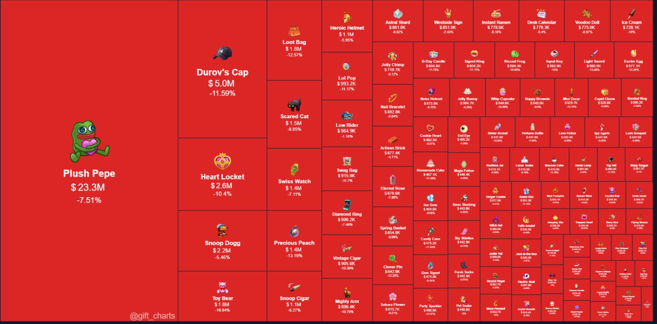 Согласно Dune Analytics, в торговле подарками сейчас задействовано более 517 565 уникальных кошельков. При этом текущая рыночная капитализация ниши составляет почти $124 млн, а полностью разводненная оценка (FDV) достигла $140 млн.