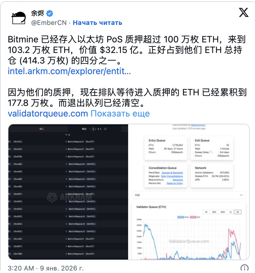 Единовременное размещение составляет примерно четверть казначейства BitMine. В результате очередь на вход выросла до 1,7 млн ETH. Это самый высокий показатель с 2023 года.