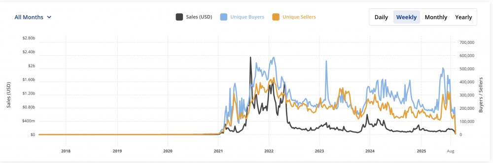 Данные о продажах NFT, уникальных покупателях и уникальных продавцах. Источник: CryptoSlam