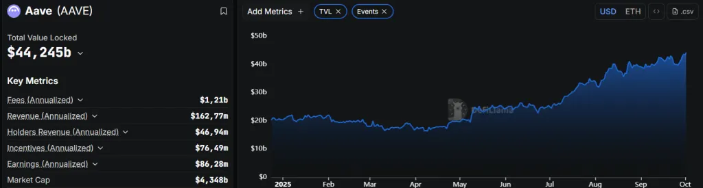 В 2025 году Aave продемонстрировала значительный рост: по данным агрегатора DeFi Llama, общий объем TVL протокола увеличился более чем вдвое — с $21 млрд до $44,24 млрд.