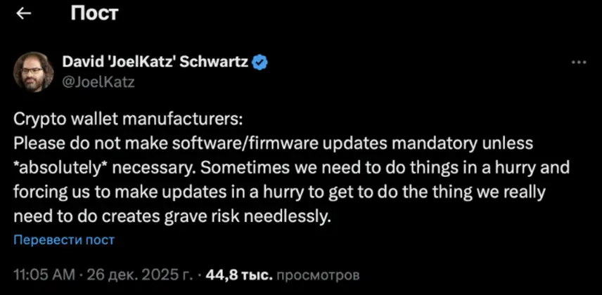 Криптограф, один из основателей Ripple и ее бывший главный технический директор Дэвид Шварц (David Schwartz) попросил производителей и операторов криптокошельков не делать обновления софта или прошивки обязательными без крайней необходимости.