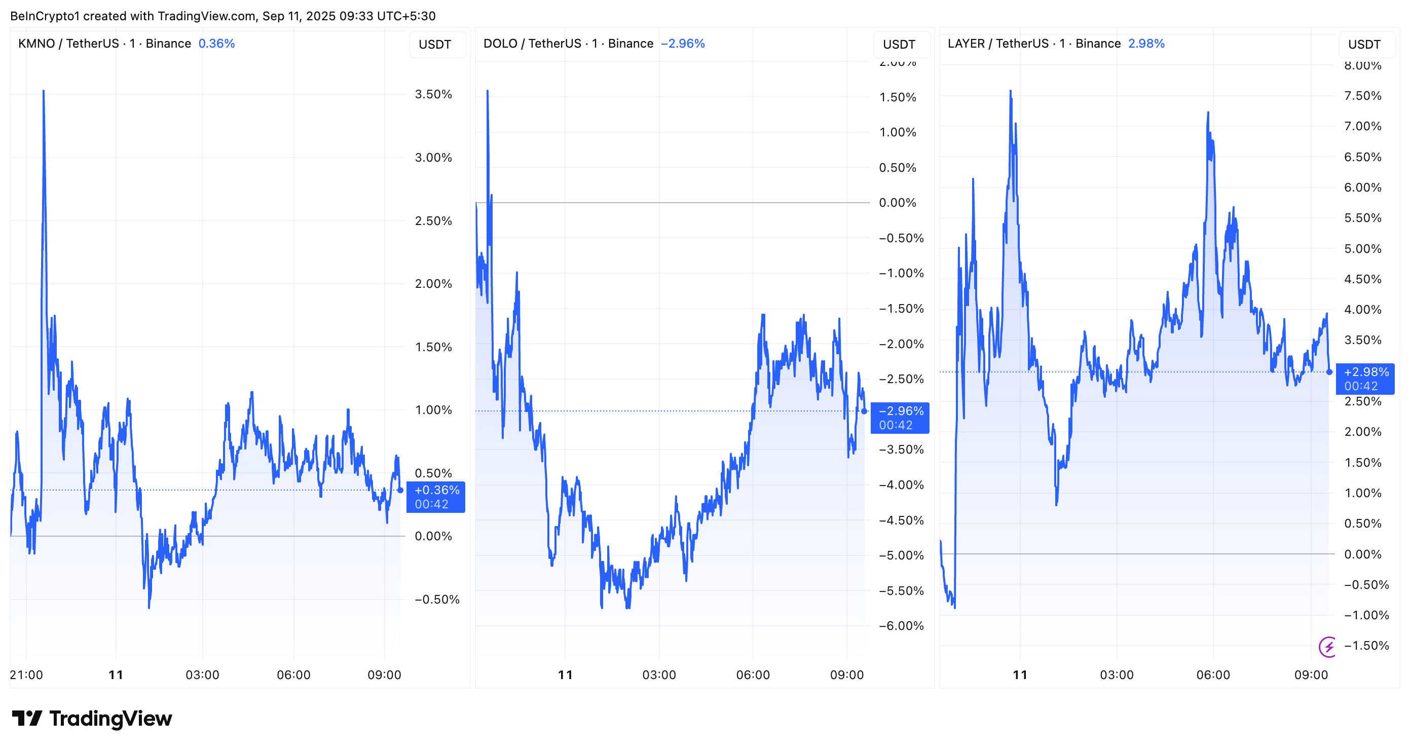После объявления токены немного подорожали. KMNO вырос с $0,057 до $0,061, что составляет 7,02%. DOLO поднялся с $0,18 до $0,195, увеличившись на 8,33%, а LAYER вырос с $0,53 до $0,58, что отражает рост на 9,43%.