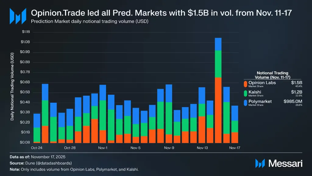 С 11 по 17 ноября Opinion возглавила рынки предсказаний по номинальному объему, достигнув $1,5 млрд. Это 40,4% от суммарного показателя Opinion, Kalshi и Polymarket ($3,7 млрд).