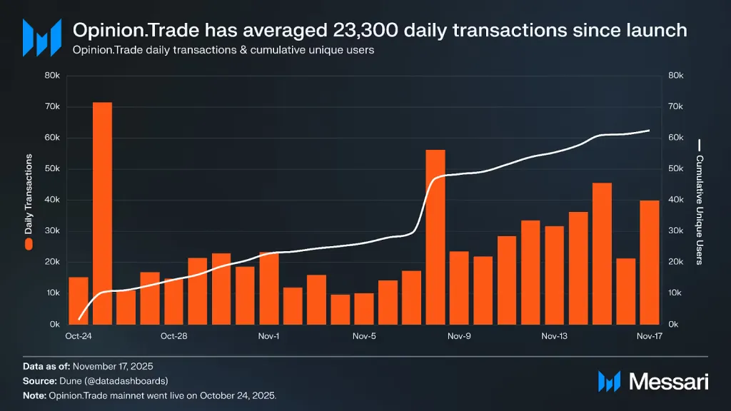Команда Opinion запустила платформу 24 октября на BNB Chain. По данным на 17 ноября, средний дневной объем торгов составил $132,5 млн. Открытый интерес (ОИ) достиг $60,9 млн — это третье место в индустрии после Kalshi ($302,1 млн) и Polymarket ($250,5 млн).