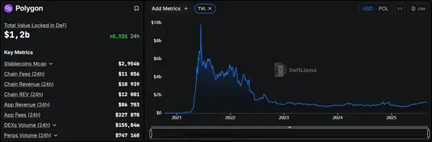 Основным показателем, характеризующим прогресс в секторе децентрализованных финансов (DeFi), выступает общая заблокированная стоимость (TVL). В марте 2025 года показатель достиг своего многомесячного минимума — $685,29 млн. Однако за последующие полгода он показал серьезный рост. На 1 сентября TVL Polygon равна $1,2 млрд, что превосходит мартовский показатель в 1,75 раза, а июльский — на 0,67%. А вот до исторического максимума $9,89 млрд, зафиксированного в июне 2021 года, пока очень далеко.