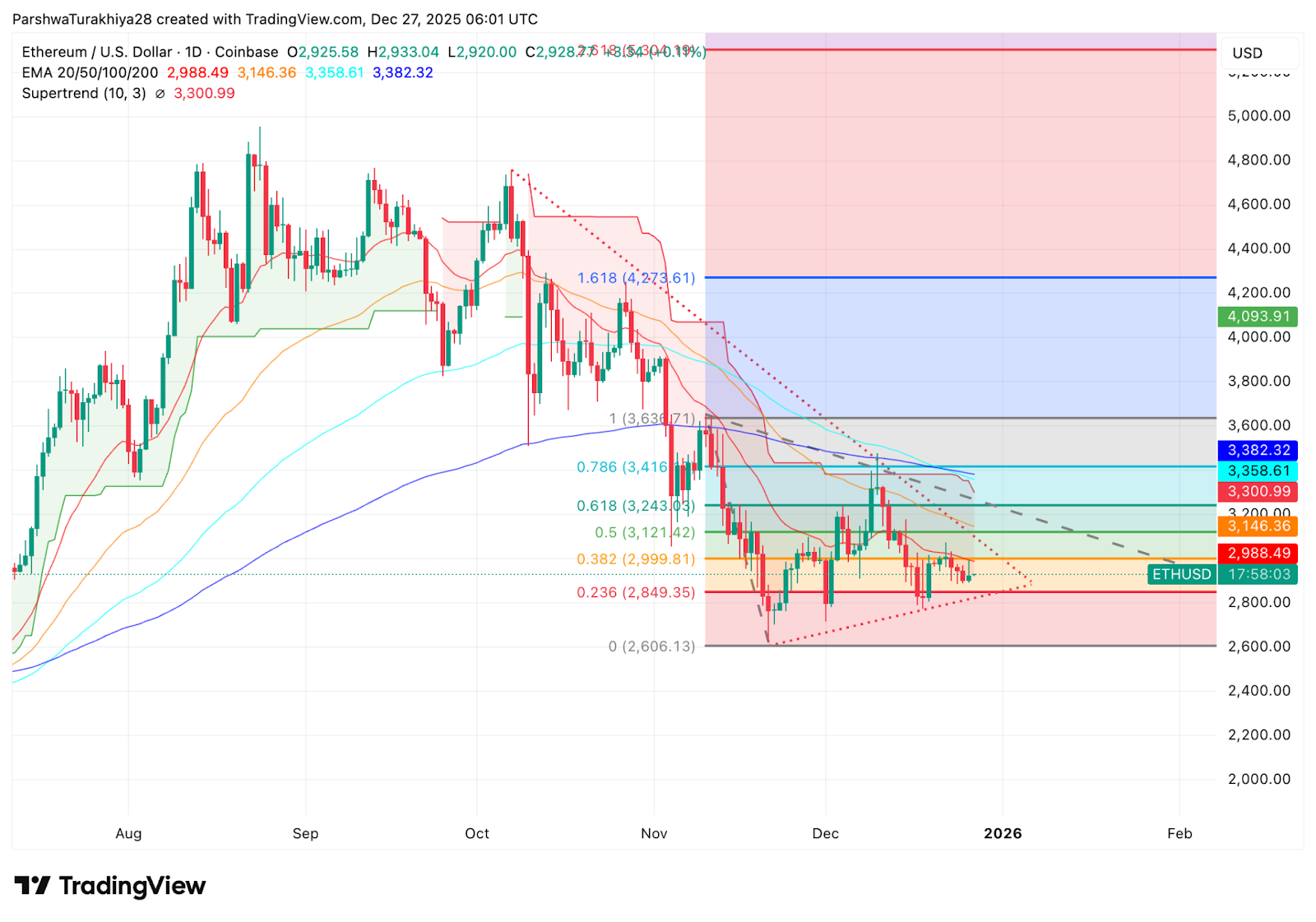 Уровни коррекции Фибоначчи, достигнутые от октябрьского максимума до ноябрьского минимума, показывают, что ETH испытывает трудности ниже коррекции 0.382 возле $3,000. Этот уровень выступал в роли опоры на протяжении всего декабря, неоднократно отталкивая цену обратно в 2 900 долларов.