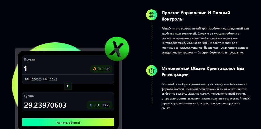 Одно из ключевых преимуществ PX1.pro — мгновенные крипто операции без необходимости создания аккаунта. Пользователю достаточно указать валюту, сумму и адрес кошелька — обмен происходит автоматически и занимает считанные минуты.