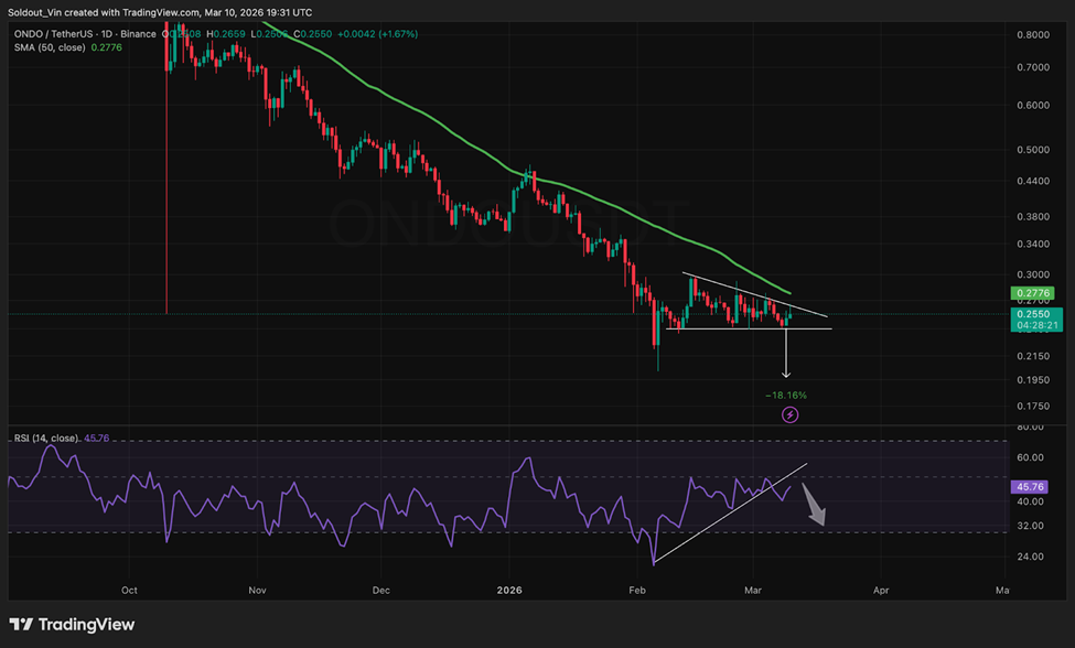 Актив потерял до 27% от январского пика 2026 года и около 12% с конца февраля. По состоянию на 25 марта 2026 года его цена составляет около $4565 за унцию, хотя ранее опускалась почти до $4100, по данным TradingView.