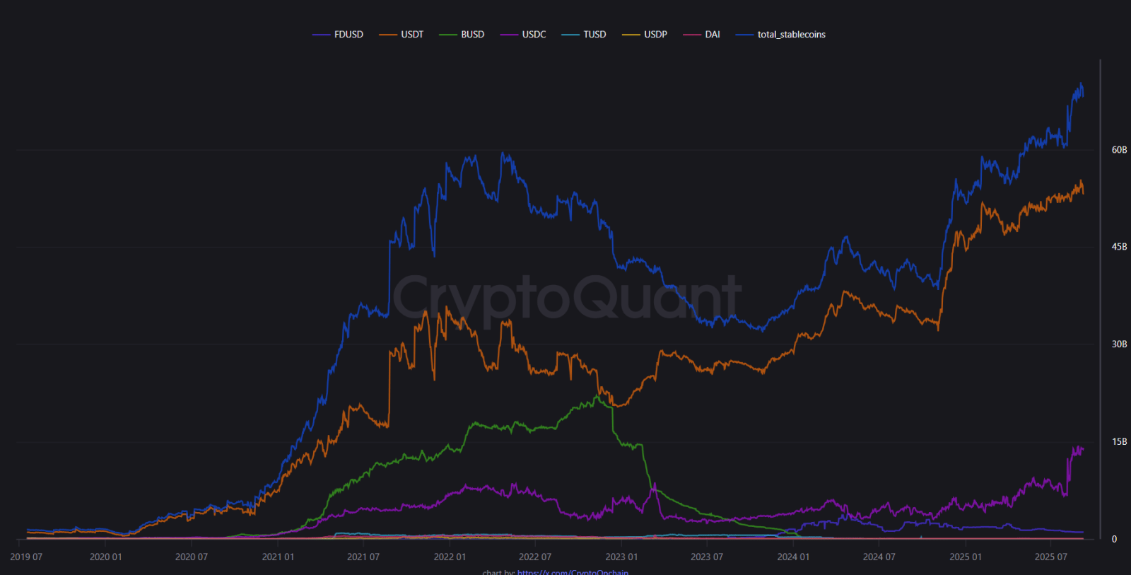 Предыдущий рекорд, установленный во время бычьего рынка 2021 года, составлял около $60 млрд. Долгое время объемы стейблкоинов на биржах оставались на этом уровне, но в августе они начали резко расти.