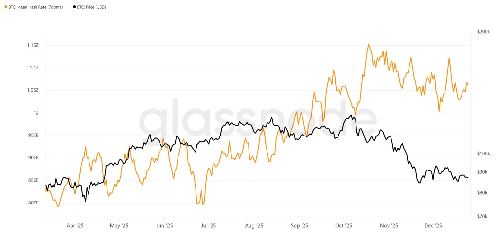 При этом хершейт биткоина удержался выше отметки 1 ZH/s. Согласно Glassnode, сглаженное семидневной скользящей среднее значение находится на уровне ~1,06 ZH/s.