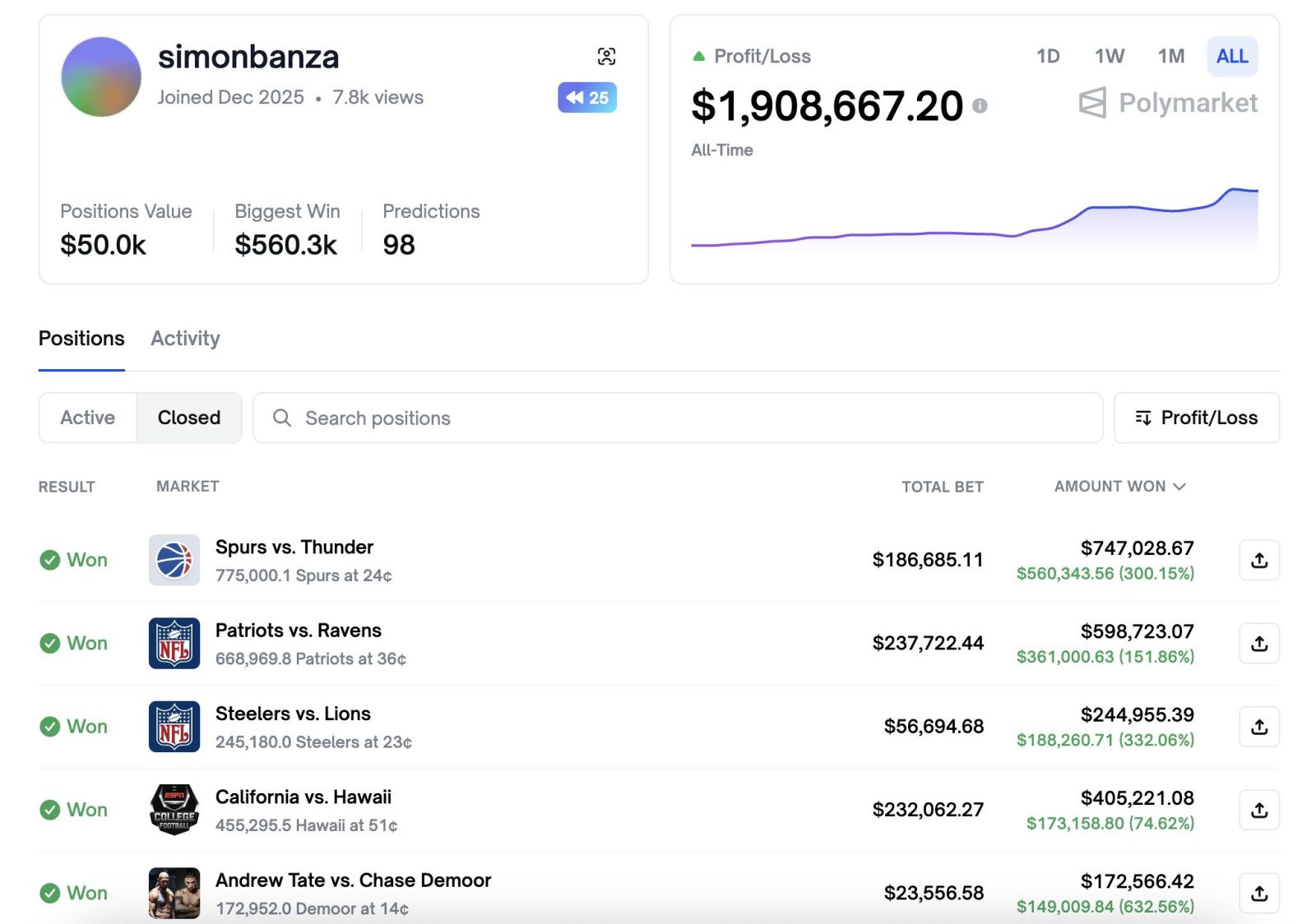 Судя по данным активности, simonbanza сделал ставку на сезон NFL и NBA. Среди его наиболее заметных закрытых сделок выделяются: