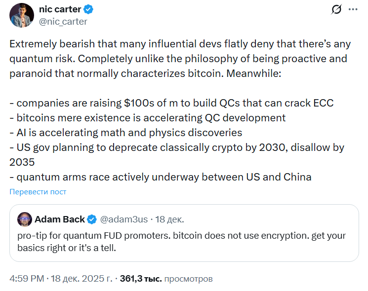 Гендиректор Blockstream и шифропанк Адам Бэк заявил, что Картер «раздувает» проблему. По его словам, разработчики не отрицают потенциальных рисков и ведут необходимые исследования, но делают это без публичной шумихи.