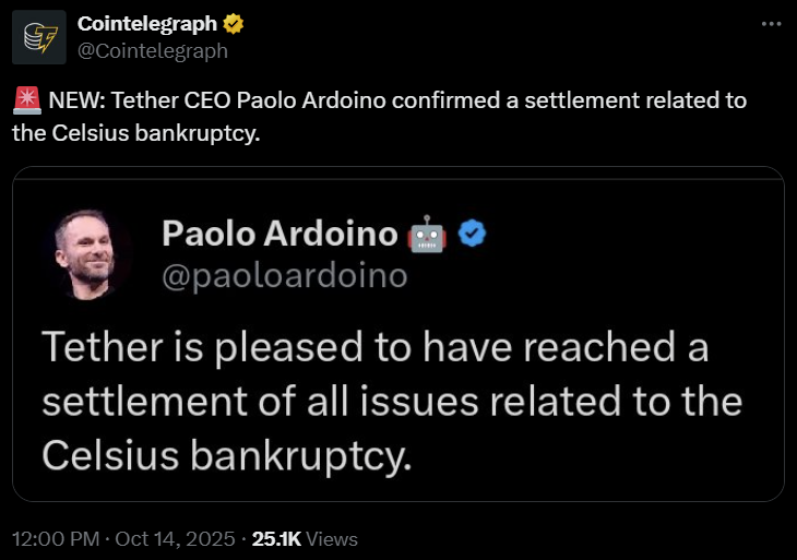 Tether урегулировал иски Celsius на $300 млн