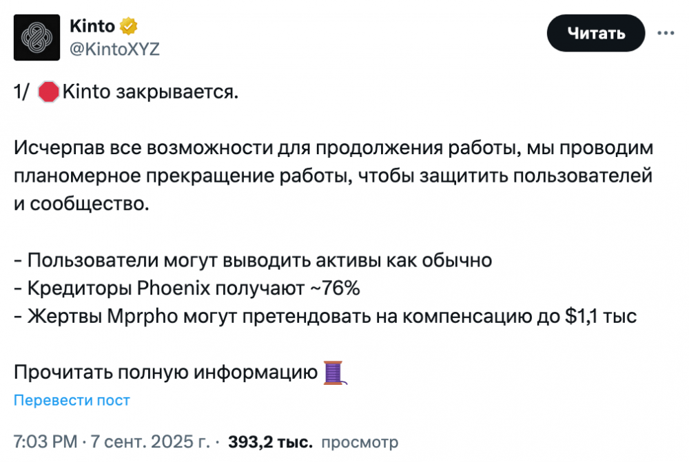 Команда Kinto призвала пользователей вывести активы до 30 сентября. После этой даты им необходимо будет заявить о своих правах на активы через бессрочный контракт, который Kinto планирует создать.