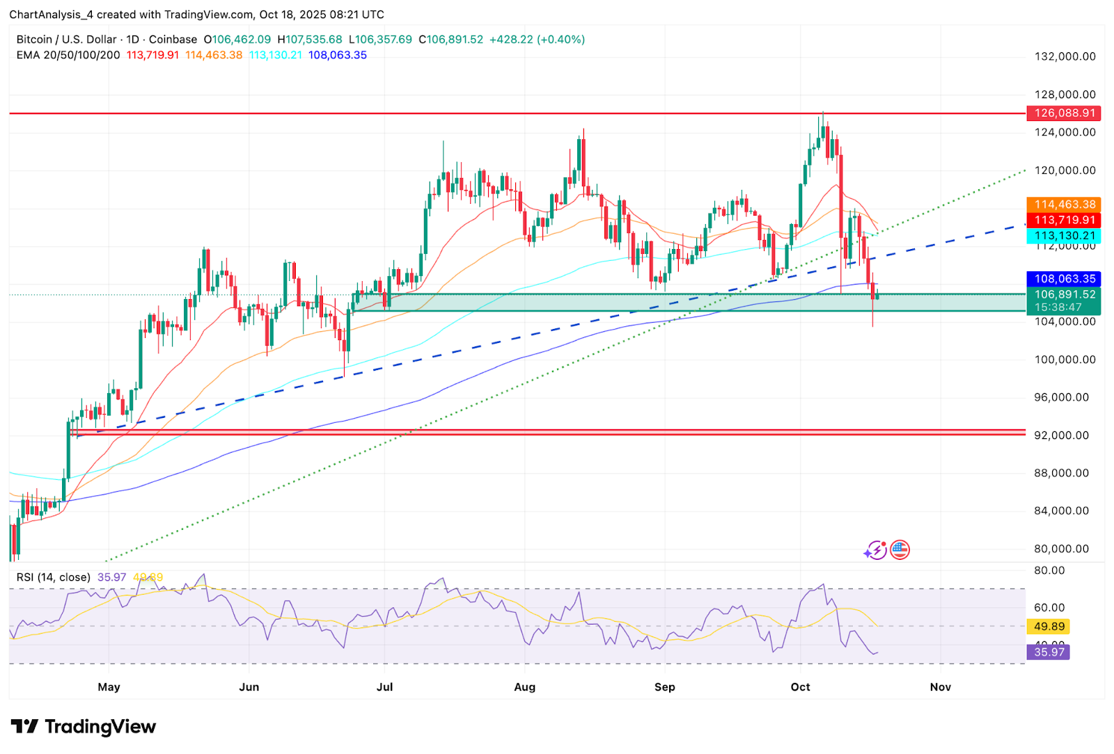 Цена биткоина сегодня консолидируется вблизи отметки $106 900, при этом покупатели пытаются удержать поддержку в диапазоне $105 000–$104 000 после волатильной недели. Это движение произошло после того, как BTC ненадолго пробил кластер 200-дневной экспоненциальной скользящей средней (EMA), что вызвало спекуляции о том, заканчивается ли коррекция или только начинается.