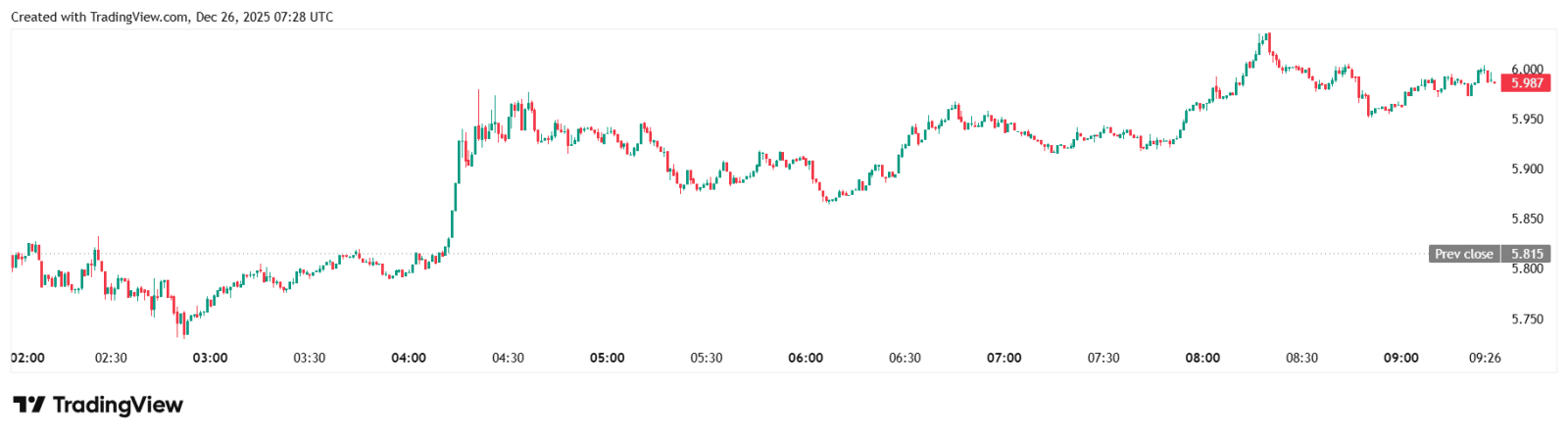На фоне новости подскочил курс актива. На суточном чарте прирост составляет 3%, на недельном — 20,7%. При подготовке этого материала токен торгуется около $6.