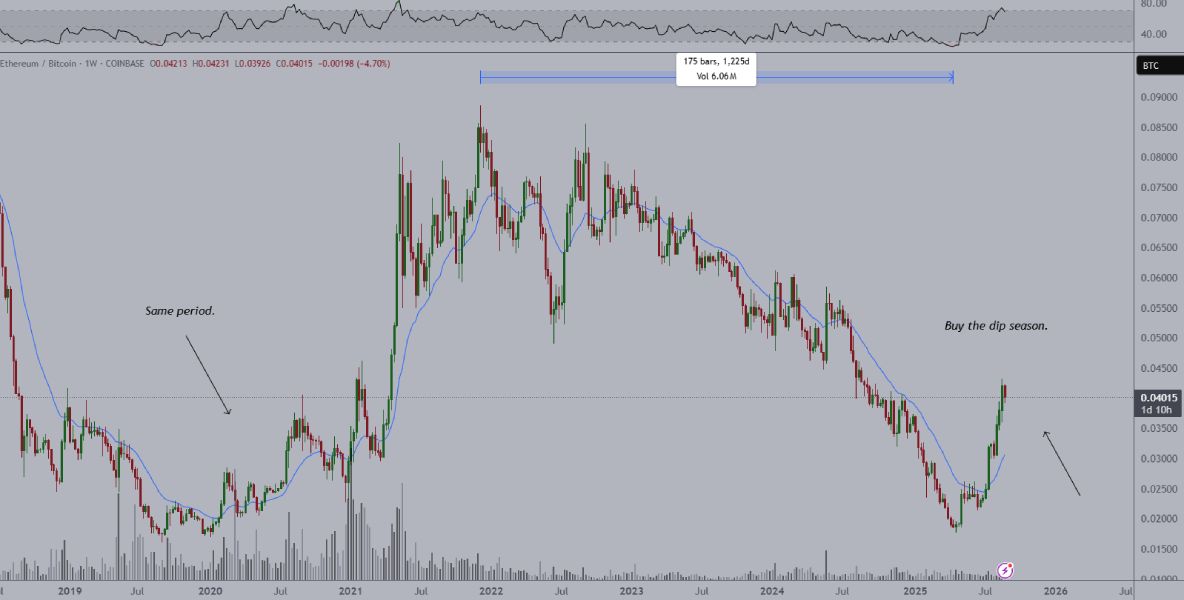 Эксперт прикрепил к своему сообщению график изменения курса ETH по отношению к цене биткоина, на котором видно, что стоимость эфириума резко пошла вверх, как это происходило в 2020-м. Поэтому ван де Поппе рекомендует приобретать ETH и считает, что BTC продолжит уступать сопернику.