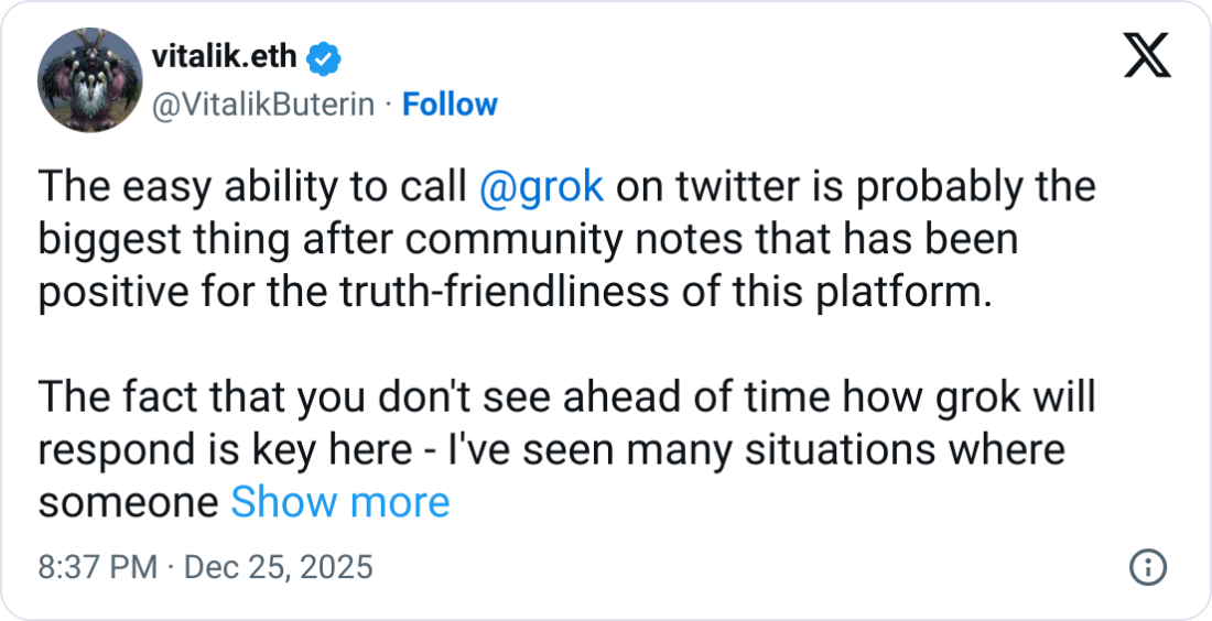 «Возможность легко вызывать Grok в X, вероятно, — самое значимое улучшение для поиска истины на этой платформе после внедрения Community Notes», — заявил Бутерин.