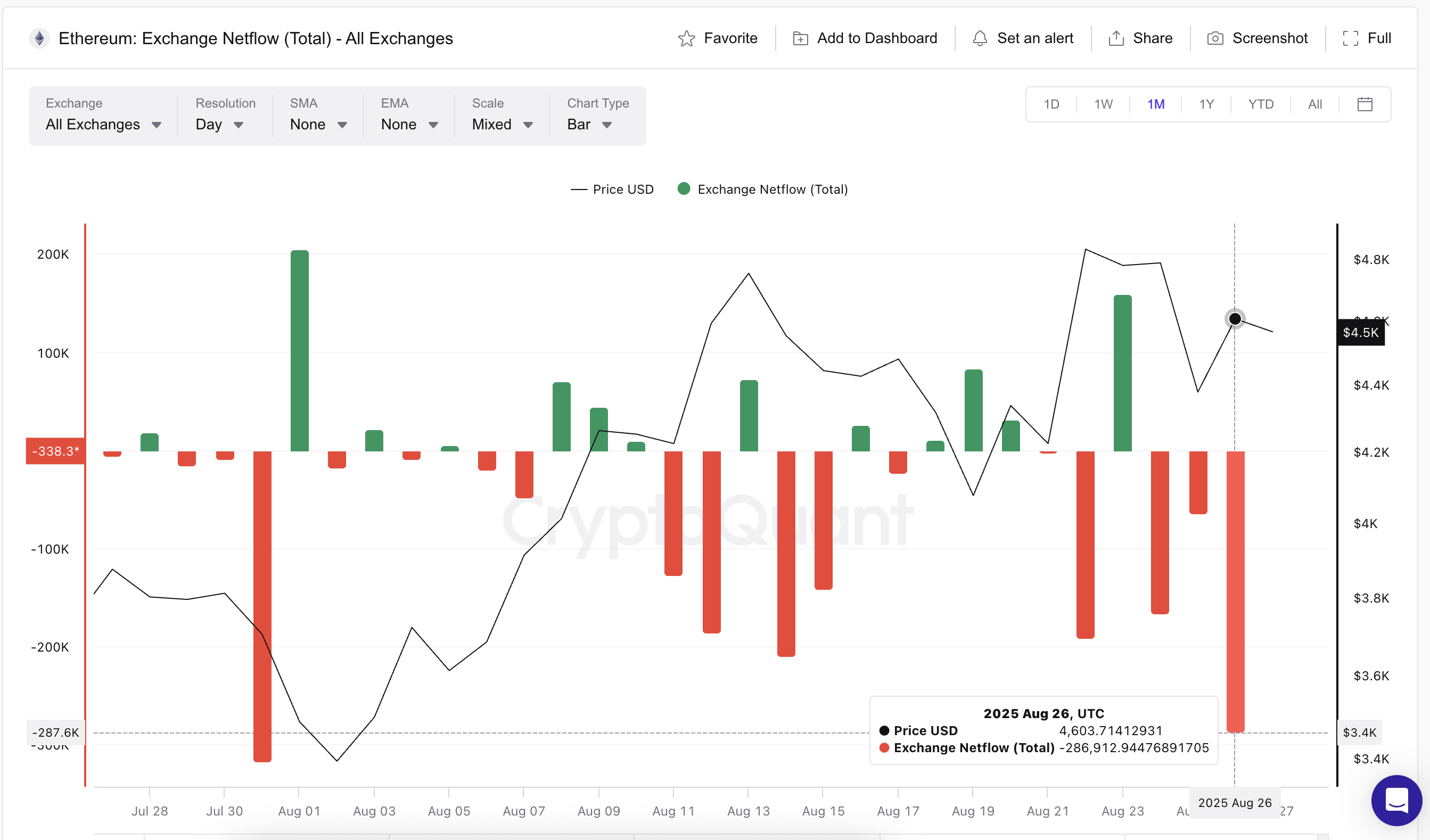 Когда больше ETH покидает биржи, чем поступает, это значит, что трейдеры выводят монеты в кошельки для хранения, а не для продажи. 26 августа отток с бирж составил почти 287 000 ETH. Это был второй по величине уровень с 31 июля, когда за один день вывели более 316 000 ETH. Тогда это движение предшествовало росту цены Ethereum с $3 930 до $4 750 за несколько дней.