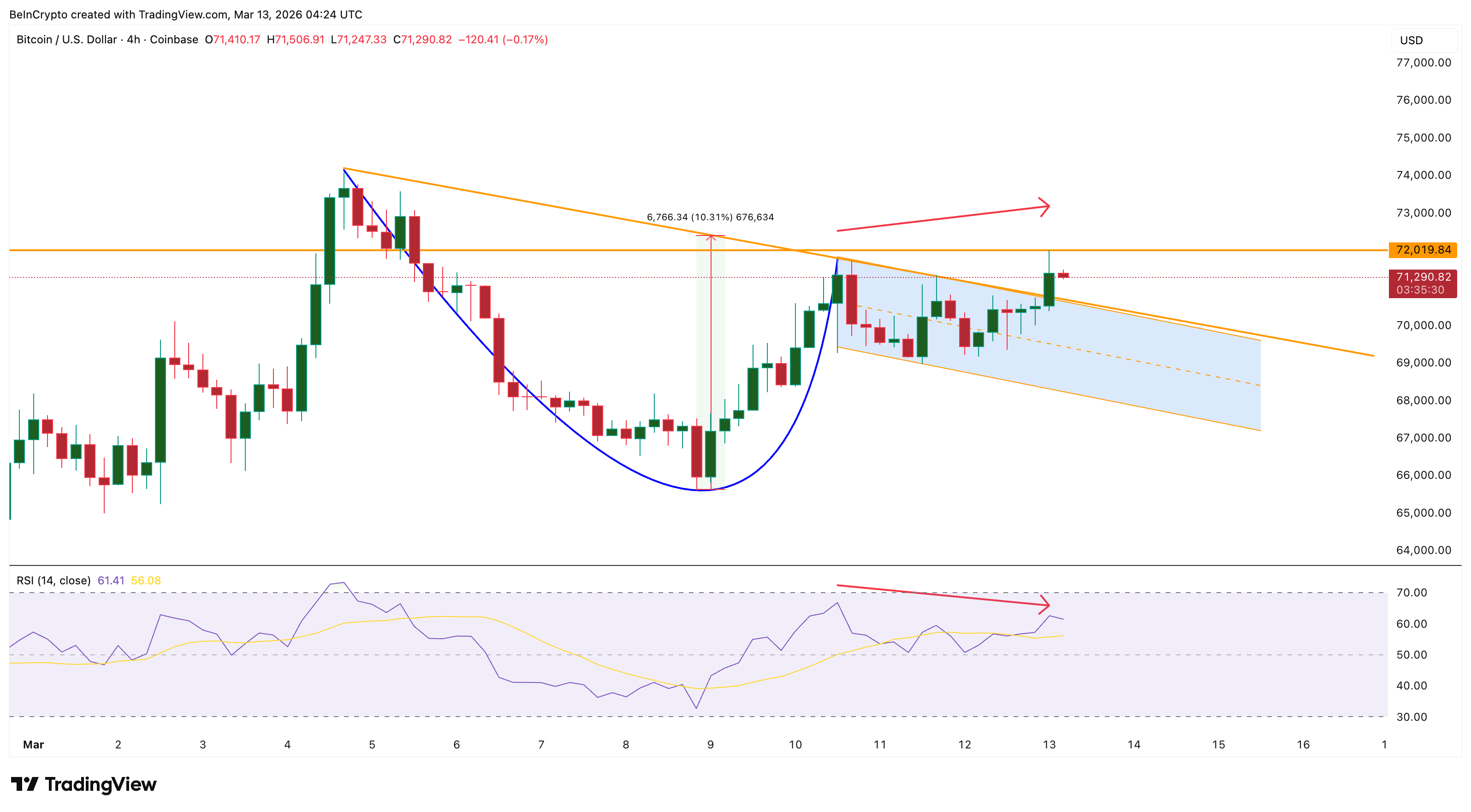 Такое расхождение называется медвежьей дивергенцией и обычно указывает на ослабление покупательского импульса несмотря на рост цены. Если биткоин не сможет восстановиться над отметкой $72 000 на четырехчасовом графике, дивергенция может запустить локальную коррекцию.